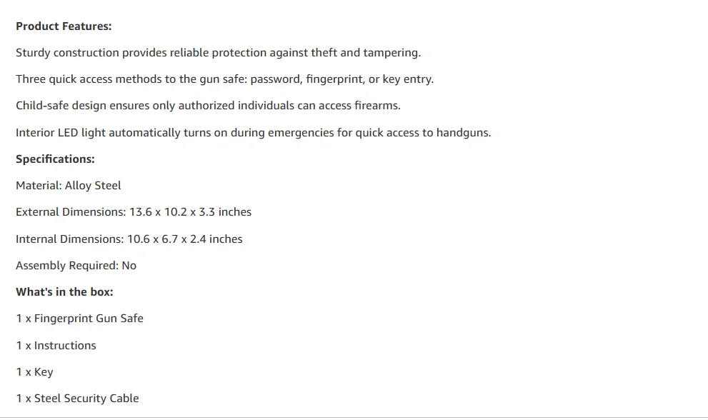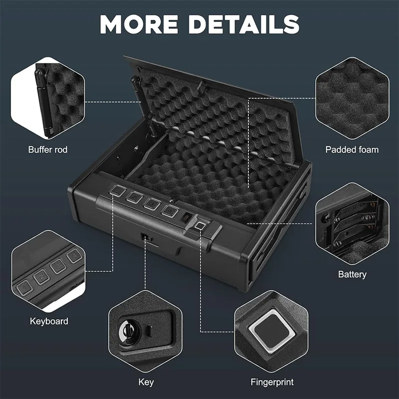 The Biometric Gun Safe Box offers secure, quick access through fingerprint recognition, keypad entry, and a traditional key for redundancy. Equipped with a Type C emergency power port, it ensures you can always access your safe even when batteries run low. Its silent operation maintains discretion, making it ideal for home defense. Designed for both safety and convenience, this safe provides reliable protection and rapid accessibility when every second counts.